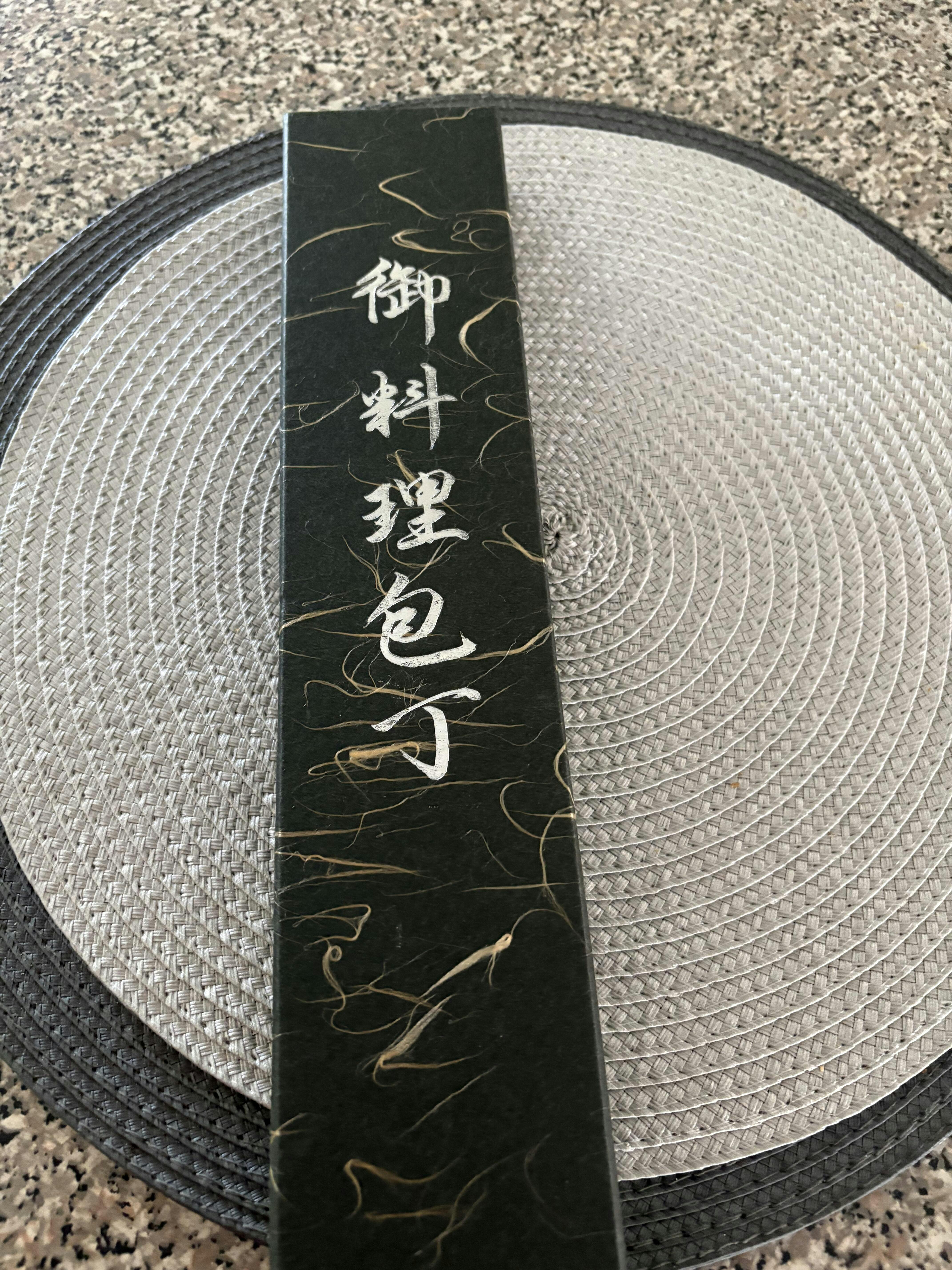 This "Kurogane" (Black Steel) series from Hatsukokoro is hand-forged using Aogami #2 steel that has been hardened to a 63-64 HRC. Kurouchi and subtle Damascus finishes improve the appearance of the blade, while choil, spine and overall finishing are more refined compared to the the "Kokugei" series. Additionally, distal and profile tapering contribute to the smoothness of the cut beyond what might be expected for the price.